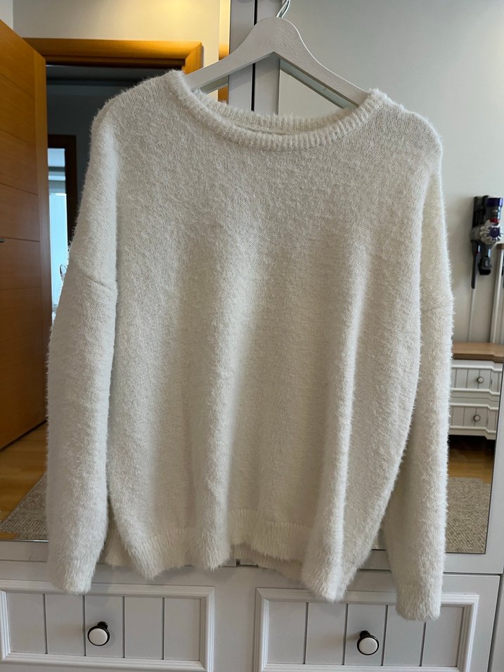 Beyaz örgü triko kazak, yuvarlak yaka ve uzun kollu tasarımıyla rahat, bol kesim ve normal boyda, günlük kullanıma uygun, yumuşak dokulu bir üründür.