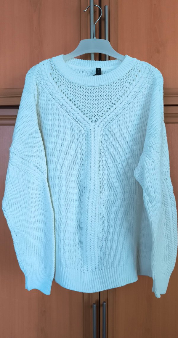 Beyaz renkli, yuvarlak yaka ve uzun kollu örgü triko kazak, rahat ve bol kesimiyle günlük kullanıma uygundur.