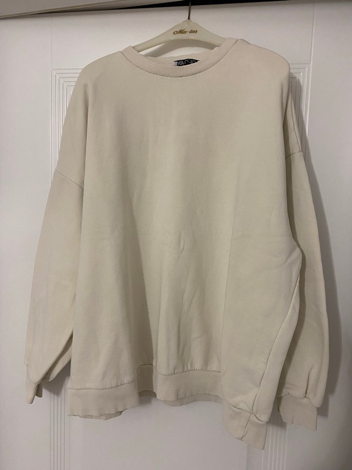 Beyaz renkli, yuvarlak yakalı ve uzun kollu kadın sweatshirtü, rahat keten kumaştan üretilmiştir. Oversize kesimi ve normal boyu ile minimalist bir tarz sunar.