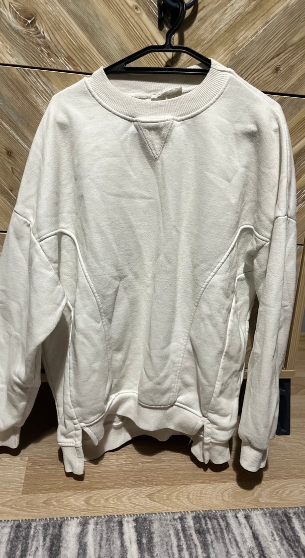 Beyaz renkli, yuvarlak yaka ve uzun kollu kadın sweatshirtü. Yumuşak keten kumaştan, bol kesim ve normal boyda, rahat ve şık günlük kullanım için uygun.