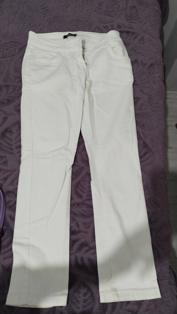 Beyaz pamuk kumaştan, normal boy midi ve regular fit kesime sahip, günlük kullanıma uygun rahat ve şık kadın pantolonu.