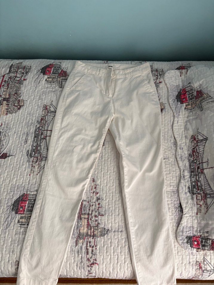 Beyaz pamuk kumaştan üretilmiş, normal boy midi uzunluğunda, rahat kesim kadın pantolonu. Günlük kullanıma uygun, sokak stiline uyumlu, zahmetsiz şıklık sunar.