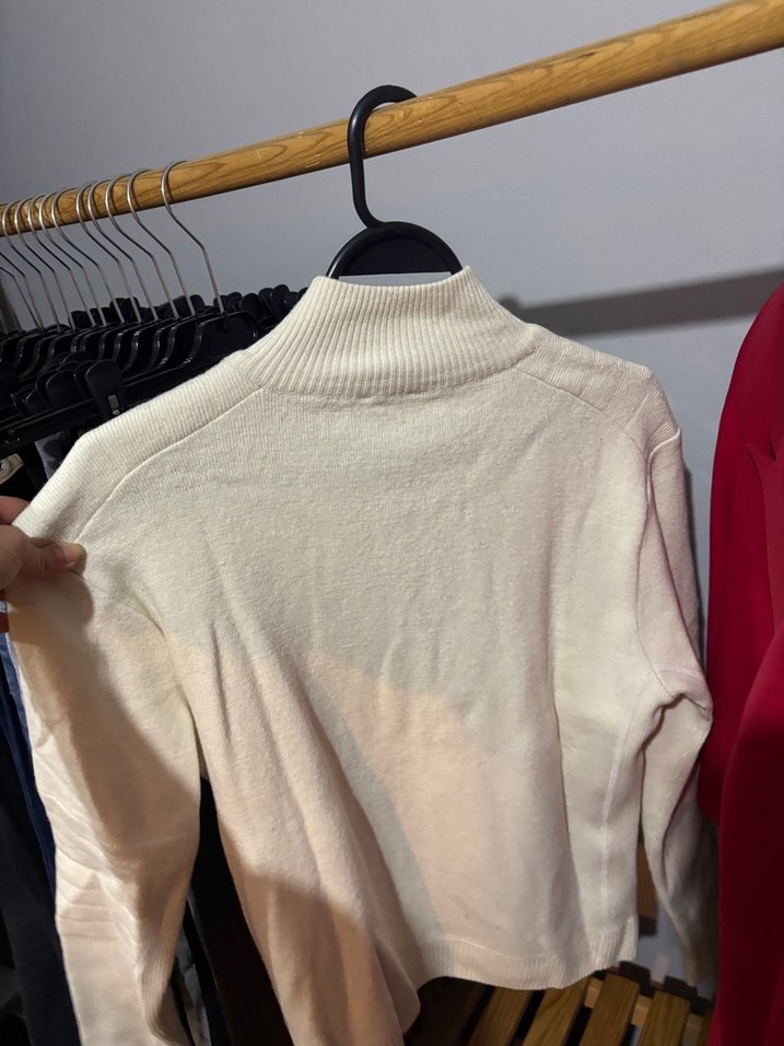 Pamuklu, boğazlı, uzun kollu beyaz triko kazak, rahat ve şık günlük kullanım için uygundur.