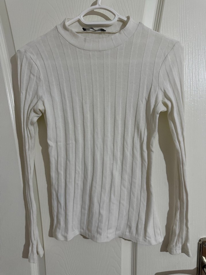 Beyaz pamuklu kadın kazak, boğazlı yakalı ve uzun kolludur. İnce triko dokusu, dar kesimi ve midi boyu ile günlük kullanıma uygundur.