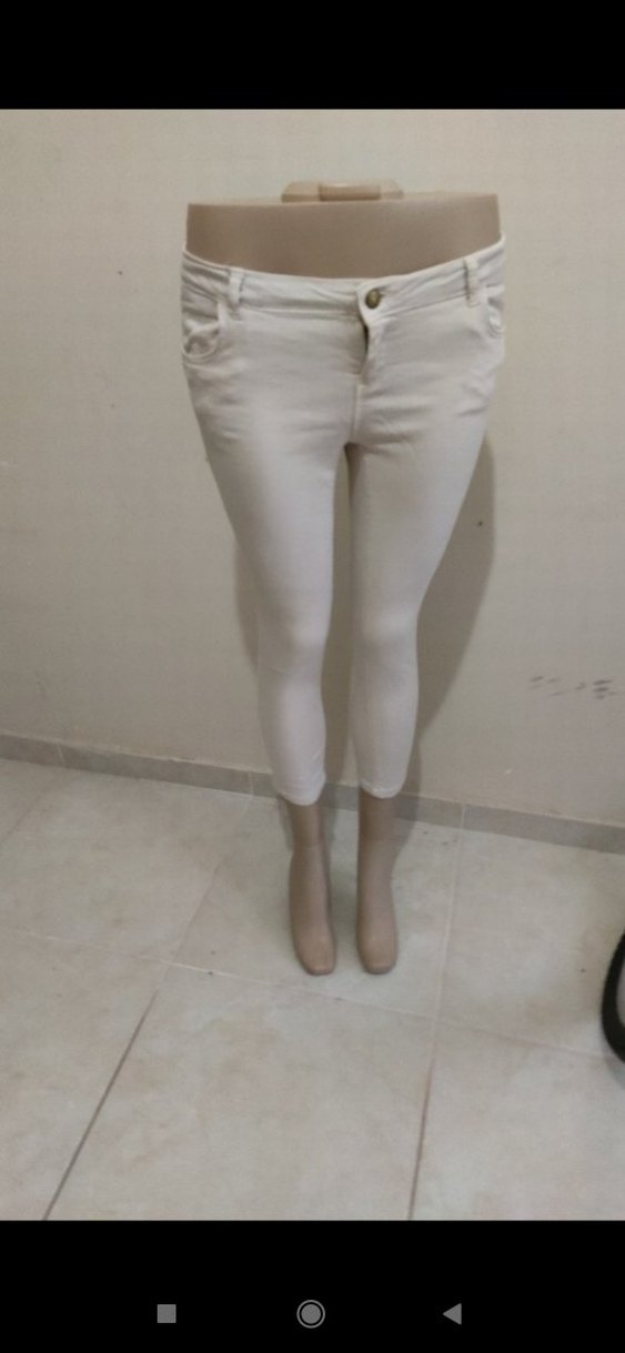 Pamuklu, beyaz renkte, normal midi boyda, vücuda oturan kadın cigarette pantolon. Minimalist ve desensiz tasarımı günlük kullanıma uygundur.