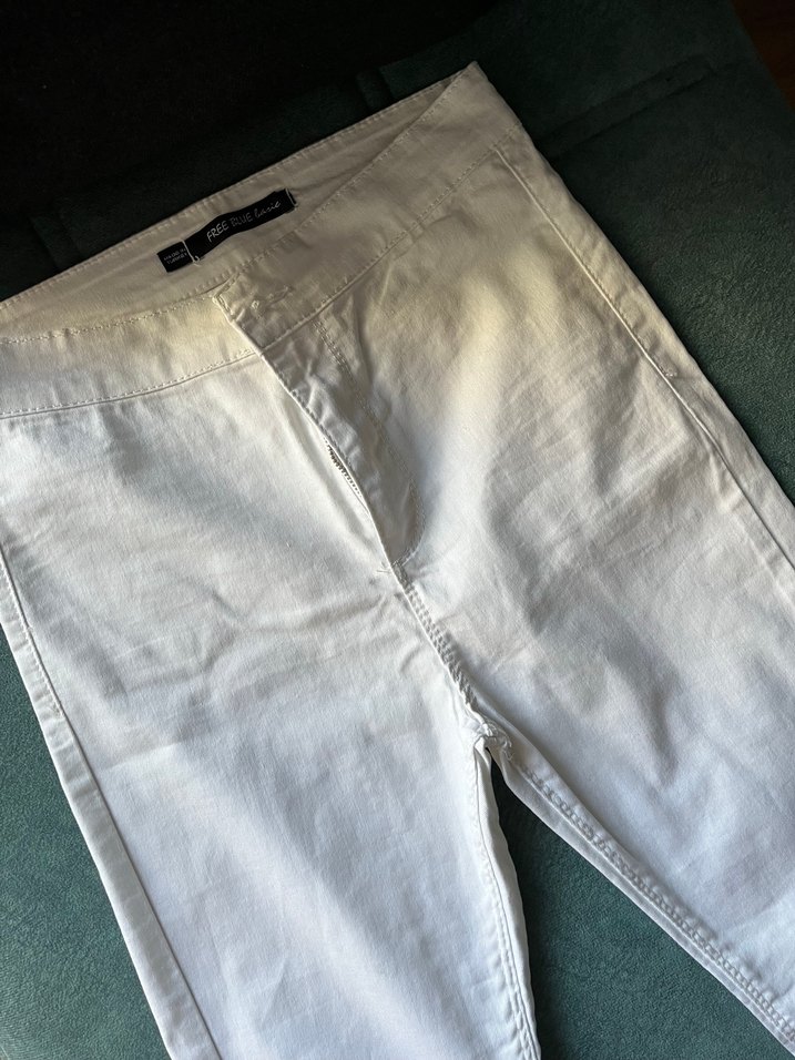 Beyaz pamuklu, midi boy, düz kesim kadın jean. Günlük kullanım için rahat ve şık bir sokak stili sunar.