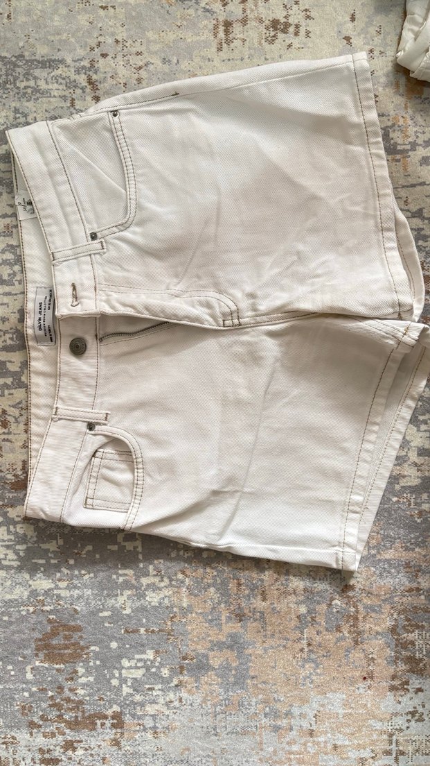 Beyaz pamuklu mini denim şortlar, rahat kesimi ve desensiz tasarımıyla günlük sokak tarzına uygundur. Zahmetsiz şıklık sunar.