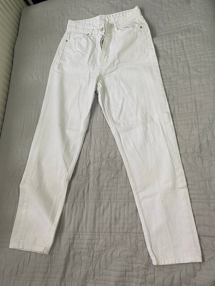Beyaz pamuklu jean, regular fit ve midi boyda. Minimalist sokak stili için sade ve şık, günlük kullanıma uygun.