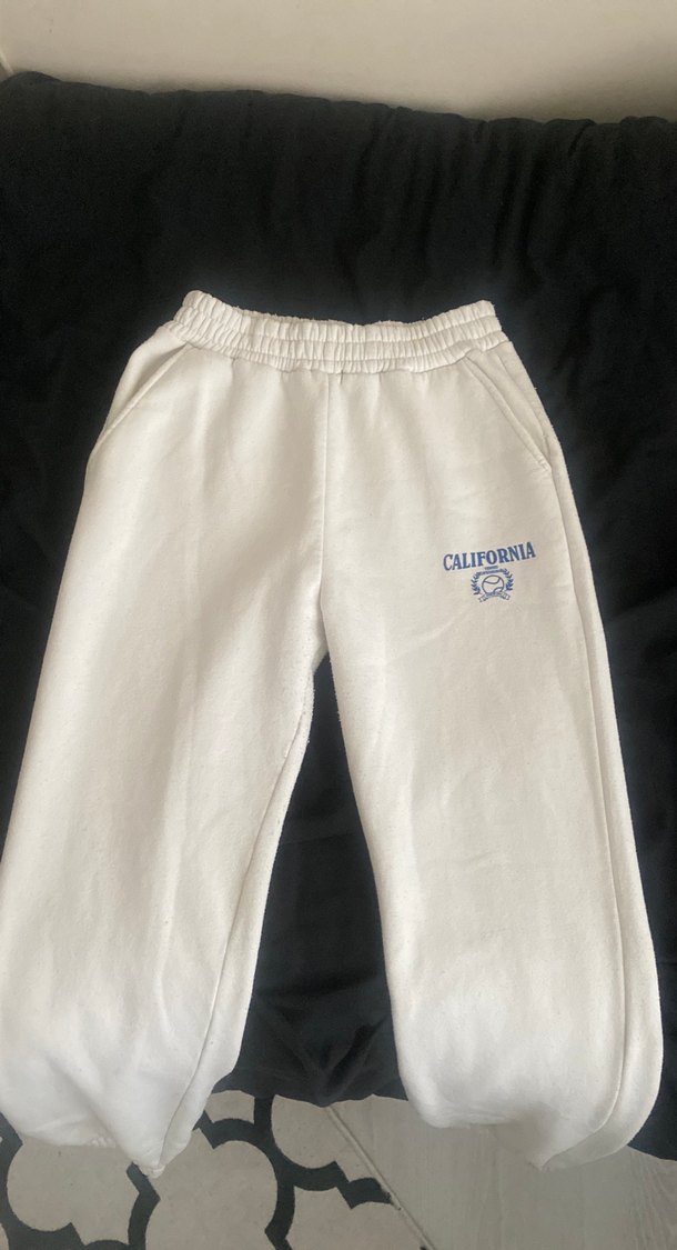 Gri "CALIFORNIA" baskılı, elastik bel ve yan cepli, rahat kesim beyaz pamuklu kadın sweatpant. Dış mekan için uygun, şık ve konforlu.