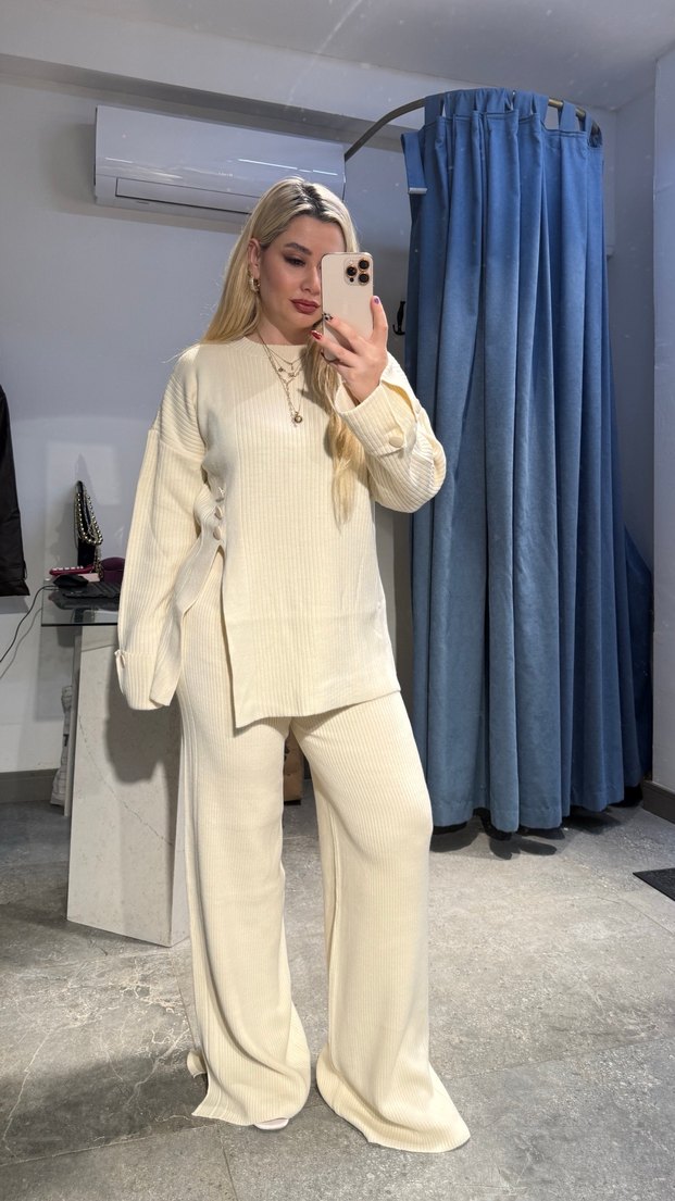 Beyaz Kadın Pamuklu Uzun Kollu triko takım