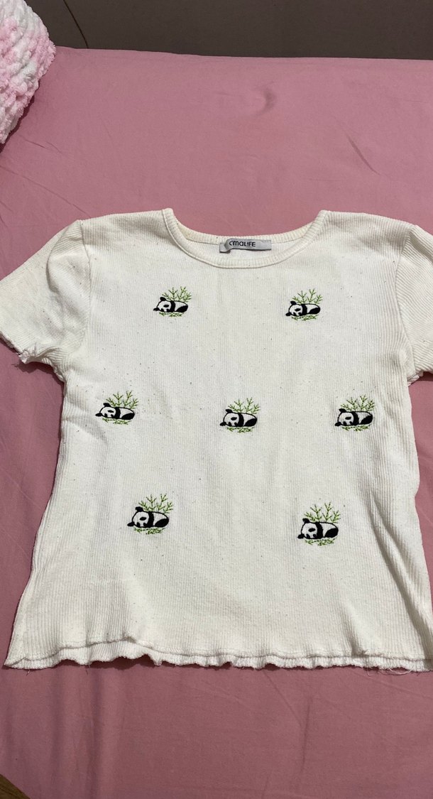 Pamuklu, örme dokulu beyaz kadın tişörtü, kısa kollu ve bisiklet yaka. Üzerinde küçük panda baskıları bulunur. Trendy ve rahat stil için uygundur.