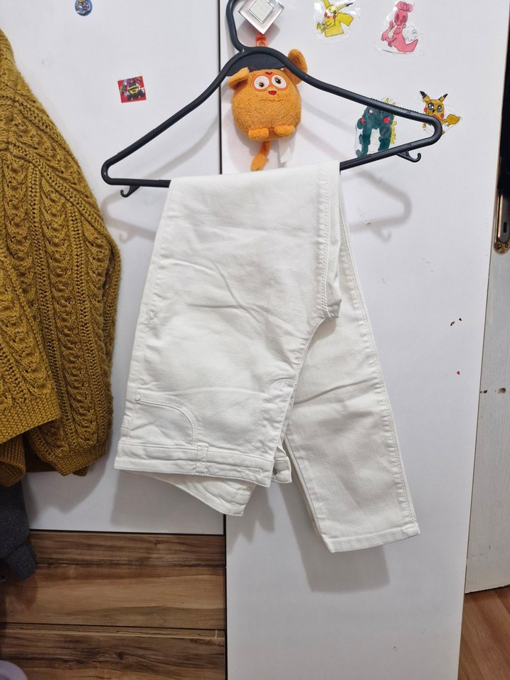 Beyaz kadın pantolon. Rahat kesimi ve desensiz tasarımıyla günlük sokak stili için uygundur.