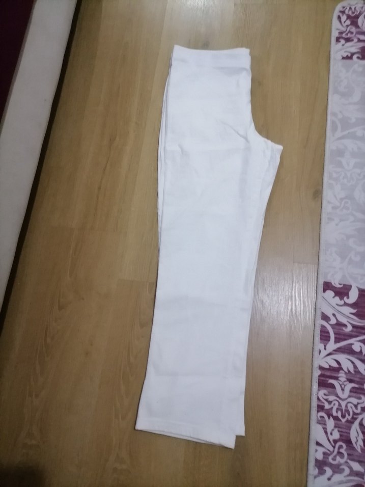 Beyaz normal boy midi uzunluğunda, rahat kesim kadın pantolon. Minimalist ve şık bir görünüm sunar. 44 46 bedenlere uygun olabilir beden etiketi yok ölçü sorabilirsiniz