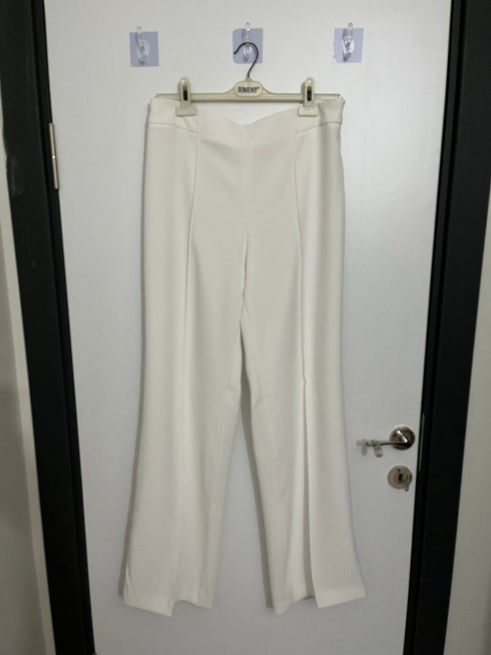Beyaz boy kadın pantolon, normal kesim ve kemerli bel ile. Düz, desensiz ve sentetik kumaştan, ofis için uygun minimalist tarzda. Orjinal