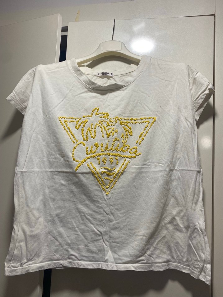 Beyaz pamuklu, kısa kollu, bol kesim ve yuvarlak yakalı tişört. Sarı boncuk işlemeli baskı deseniyle sokak modasına uygun. Günlük kullanıma uygundur.