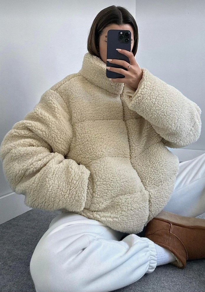 Beyaz Kadın Peluş Kışlık Mont Yüksek Yaka