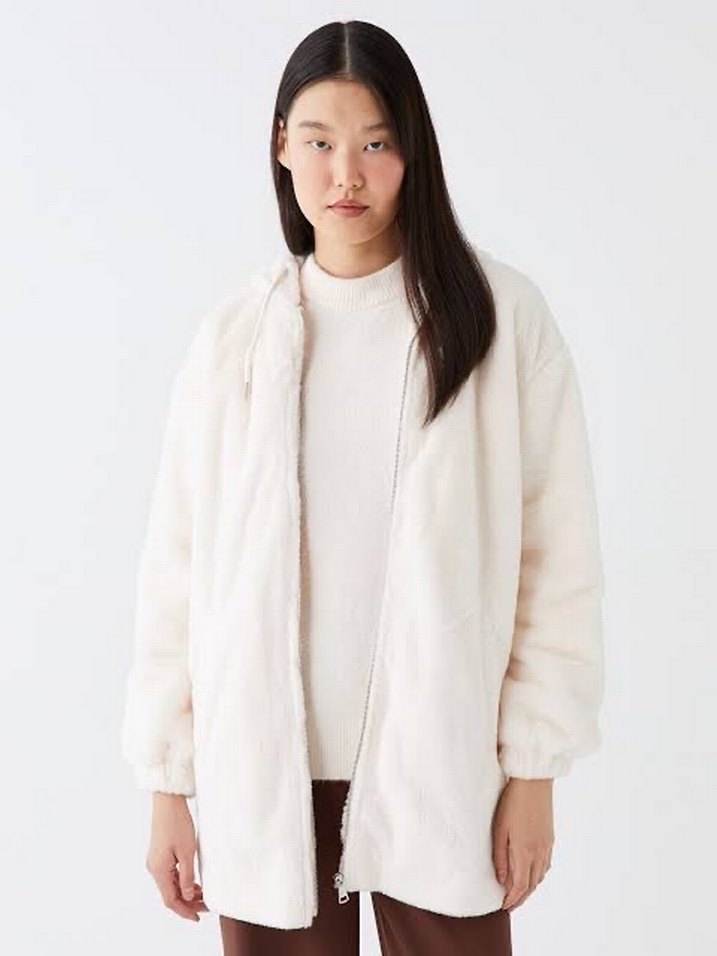 Beyaz, bol kesim ve uzun kollu bu ceket, yumuşak peluş kumaştan ve kürk detaylıdır. Günlük kullanıma uygun rahat sokak stili sunar. ❄️