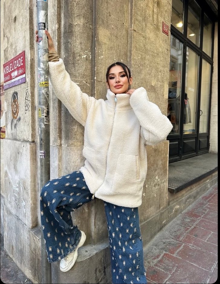 Beyaz peluş kumaştan, kürk detaylı, notched yakalı, uzun kollu, bol kesim midi kadın ceket. Rahat ve gündelik sokak stili için uygundur. Ön cep kısımlarında eşitsizlik mevcut başka sorunu yoktur çift fermuar detaylıdır.sıfır etiketli üründür. Geri iade yoktur.