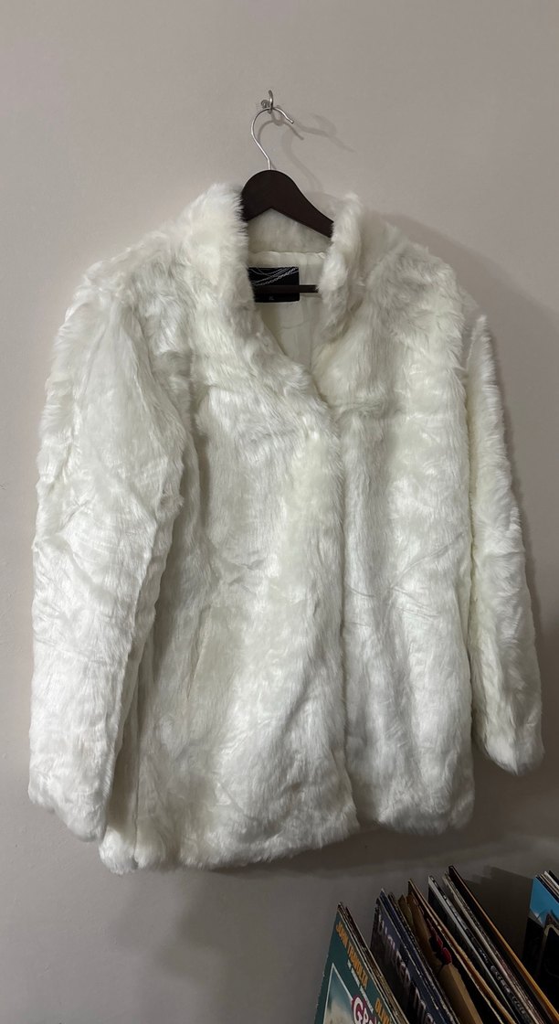 Beyaz suni kürk ceket, uzun kollu ve kesimli yaka detaylıdır. Bol kesimi ve parlak dokusuyla rahat ve şık bir görünüm sunar. ✨