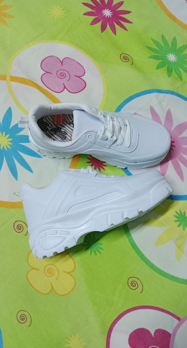 Beyaz, kauçuk tabanlı kadın platform spor ayakkabısı. Athleisure ve street wear tarzına uygun, desen içermeyen sade ve temel tasarım. Hiç giyilmedi etiketli