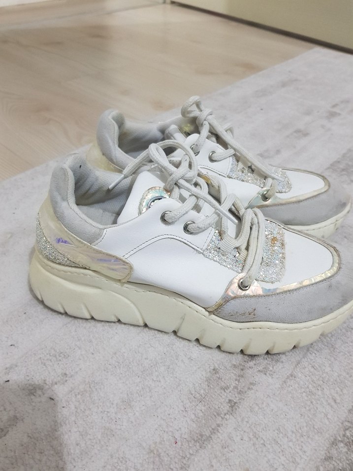 Beyaz kadın spor ayakkabısı, platform tabanlı kauçuk malzemeden üretilmiş ve bağcıklı tasarım.ortapedik ici yuksek ayak yapisina uygun orjinal temiz pazarlik olur.ustunde renk kombinasyonlari isiktan oyle gozukmus
