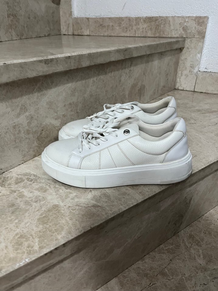 Beyaz, platform tabanlı kadın spor ayakkabısı. Rahat kauçuk taban ve sade tasarımıyla günlük kullanım için uygundur. Az kullanılmış rahat taban