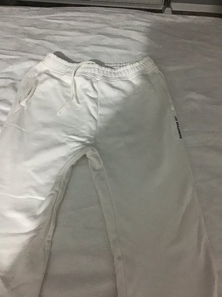 Nefes alabilen kumaştan yapılmış, bol kesim ve normal boy beyaz eşofman, rahat dış mekan kullanımı için uygun. orjınal les benjamıns markadır