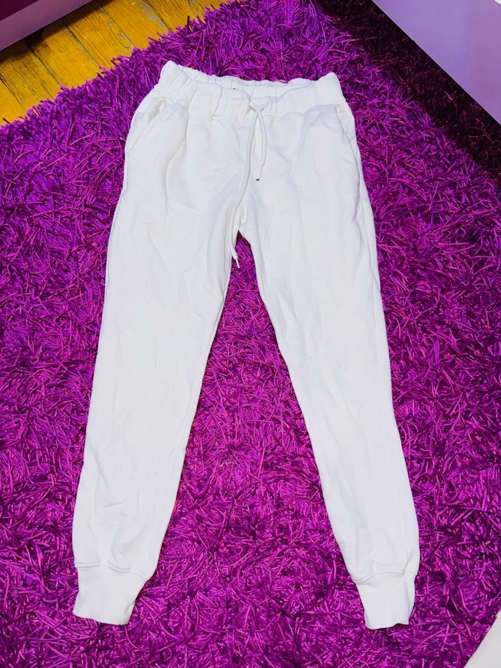 Kadınlar için rahat kesim ve normal boyda, yumuşak ve sıcak kumaştan üretilmiş beyaz eşofman altı. Dış mekan ve günlük sokak stili için şık ve rahat bir parça.