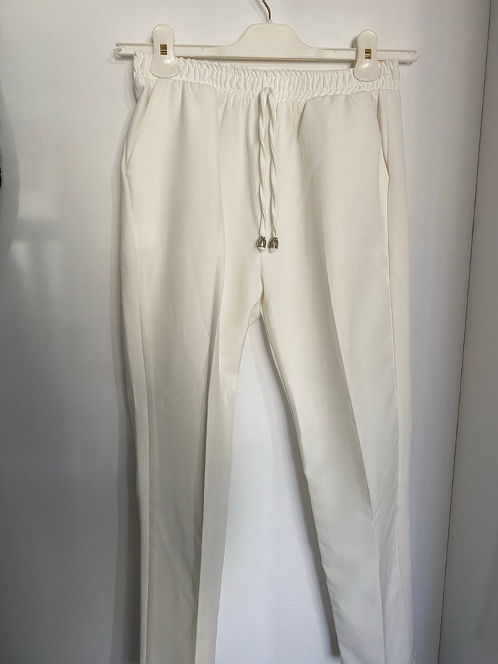 Beyaz, regular fit, midi boyu kadın kumaş pantolon. Elastik bel ve bağcıklı, sade ve şık tasarım. Günlük rahatlık için uygun.