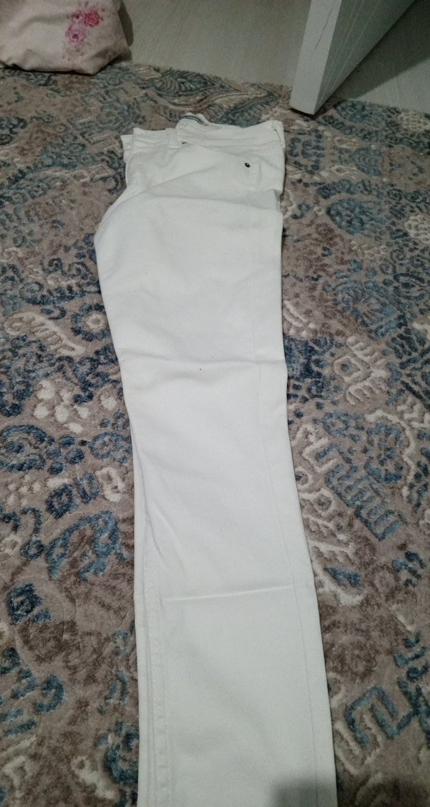 Beyaz, regular fit, kemerli, midi boy kumaş pantolon. Desensiz, günlük sokak stiline uygun.