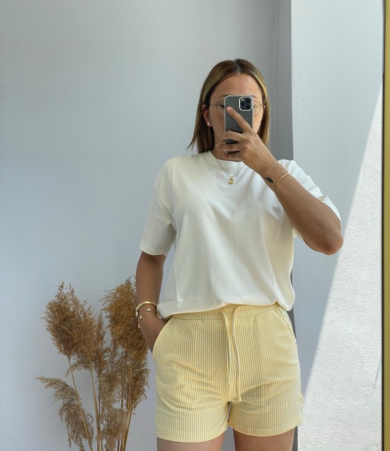 Pamuk kumaştan beyaz, salaş kesim mini Bermuda şort. Günlük kullanıma uygun, sade ve şık tarzda rahat kesim.