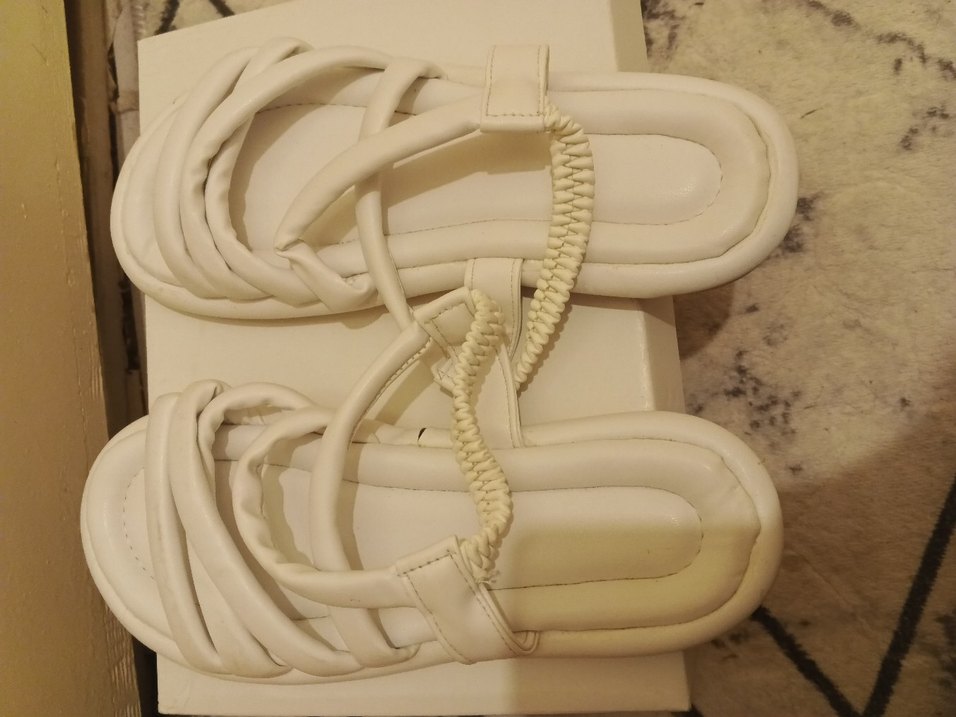 Beyaz renkli, lastikli bantlara sahip kadın sandalet. Minimalist ve bohem tarzıyla günlük kullanıma uygun. pembe parmak arası terlik ikisinin fiyatıdır ayrı almak isterseniz ilan acabilirim 40 numara ama kalıplar 39 için
