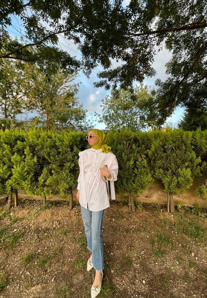 Beyaz omuz detaylı kemerli yazlık gömlek