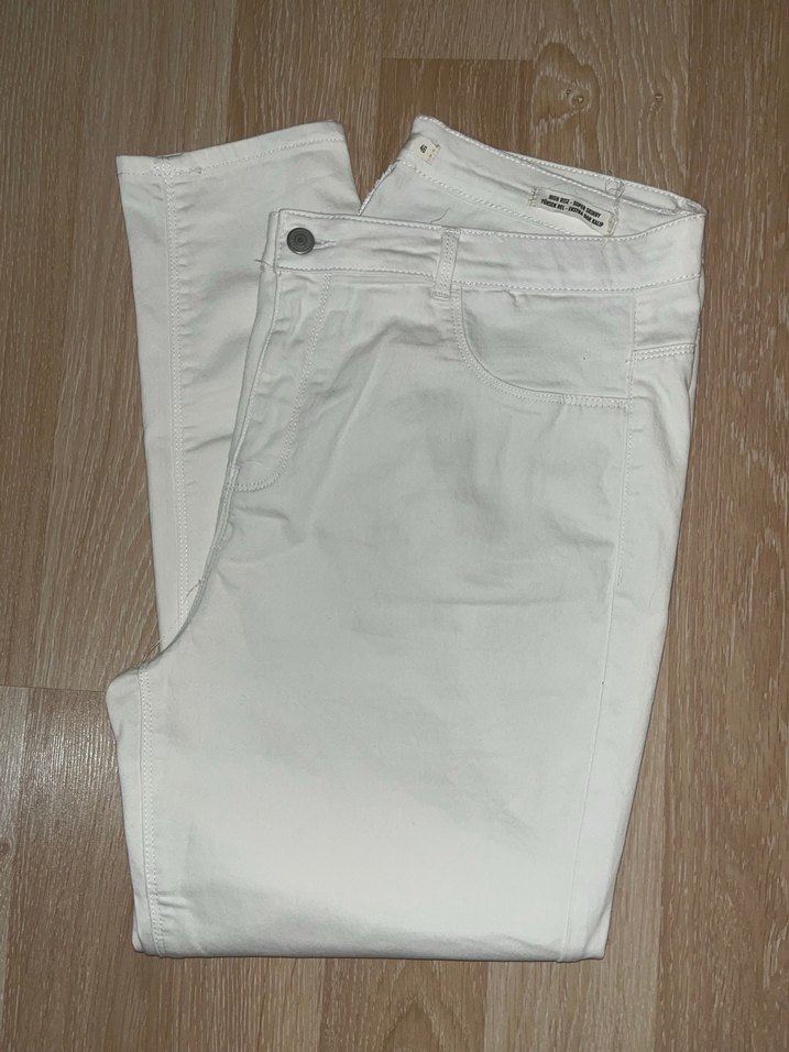Beyaz pamuklu, normal boy ve düz kesim skinny pantolon. Sade tasarımıyla rahat ve şık bir görünüm sunar. İnce bir kumaşı var yaz için uygun. Ön cebi yoktur. Ürünün hiçbir defosu yoktur.
