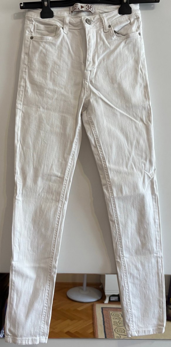 Beyaz, normal boy ve regular fit skinny kadın pantolon. Minimalist, desen içermeyen normcore tarzıyla günlük kullanıma uygundur.