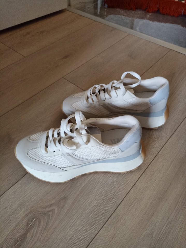 Beyaz renkli, snekar kadın spor ayakkabısı. Düz tasarım ve kauçuk tabanlı, spor ve sokak stili için uygun. Zahmetsiz şıklık sunar.