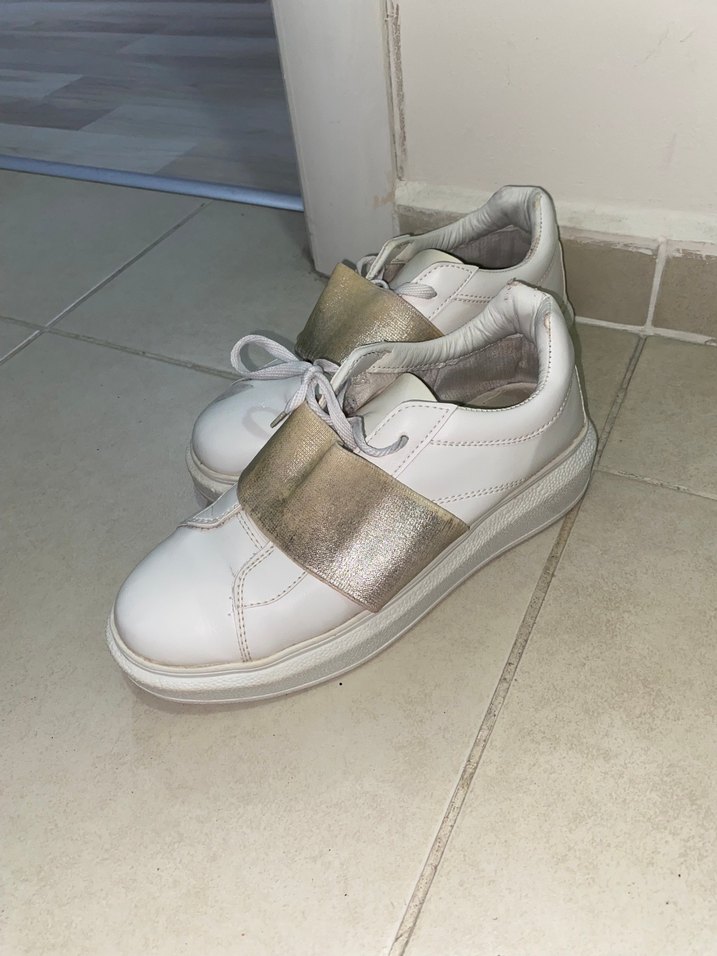 Beyaz kadın spor ayakkabıları, bantlı ve kauçuk tabanlıdır. Sokak stili ve rahat athleisure görünümü sunar.
