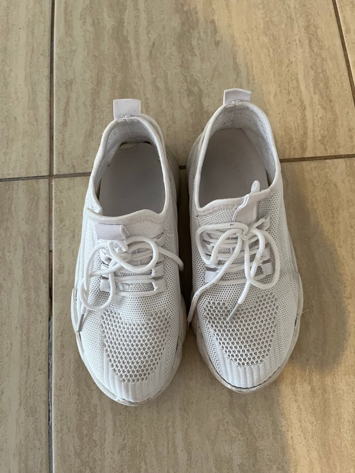 Beyaz, lastik malzemeden kadın spor ayakkabısı, sade ve desensiz tasarıma sahip. Spor ve sokak giyimine uygun, zahmetsiz şıklık sunar. Çok az kullanılmıştır. 37 numara. Kirlendiğinde Makinaya atabilirsiniz bembeyaz olur. Hiçbir sorunu yoktur.