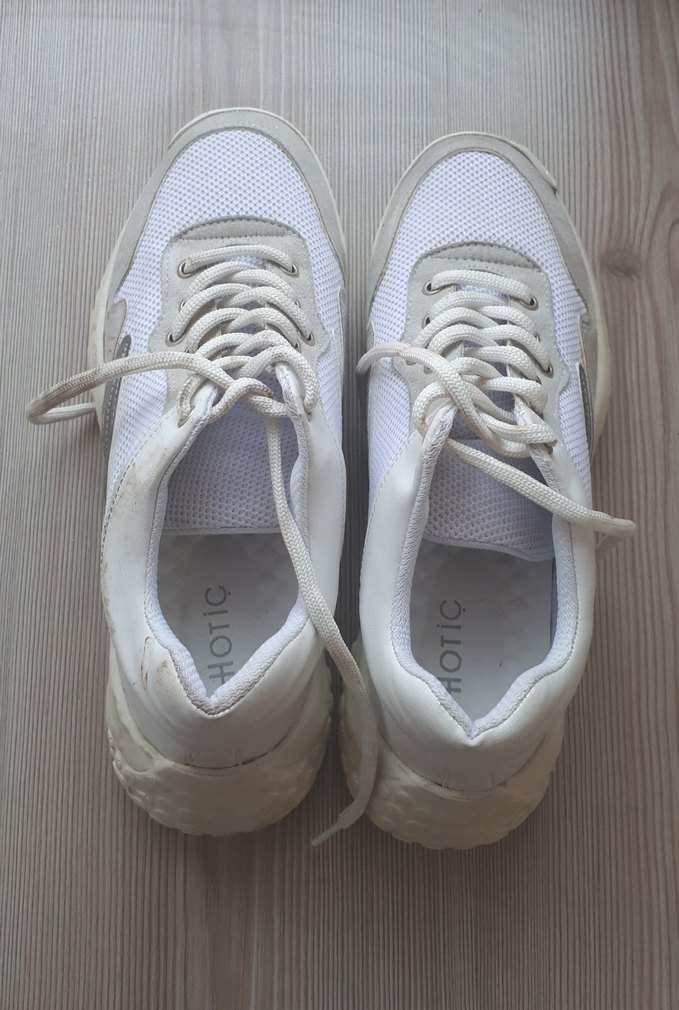 Beyaz renkte, elastik detaylı ve stiletto topuklu kadın spor ayakkabısı. Kauçuk malzemeden yapılmış, normcore tarzında, sportif ve trend günlük kullanım için uygun.