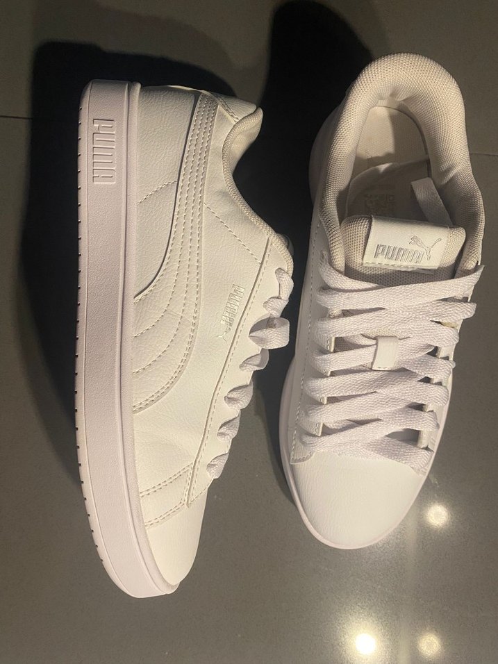 Beyaz renkte, dolgu kadın spor ayakkabısı. Kauçuk tabanlı, baskılı sokak giyimi tarzında, spor ve athleisure için uygun. ♀️