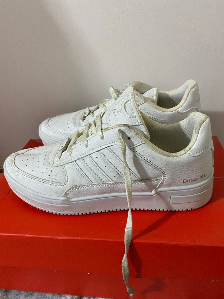 Beyaz, lastik malzemeden yapılmış, stiletto topuklu kadın spor ayakkabısı. Hafif ve deseniz, spor ve günlük rahat stil için uygundur. Rahat ve şık görünüme sahiptir. üstüne ayakkabı koyduğum için bi tık kirlenmiştir ama normalde hiçbir kusuru yoktur sadece 2 kere tek giymişimdir