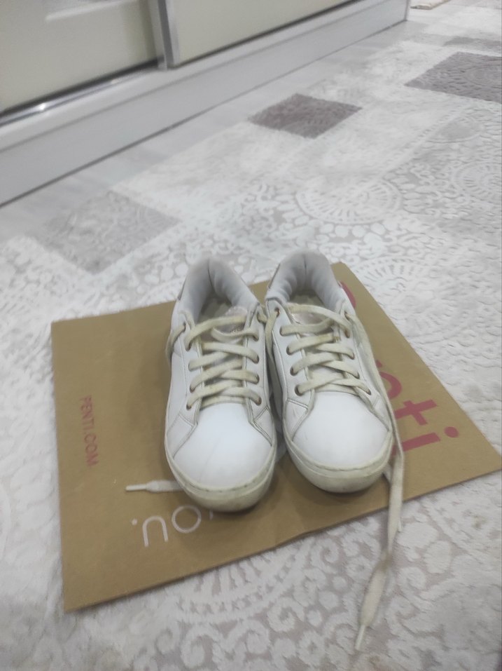Beyaz, düz tabanlı kauçuk tabanlı kadın spor ayakkabısı, Velcro detaylı. Pastel tonlarında, günlük sokak stiline uygun sade tasarım.