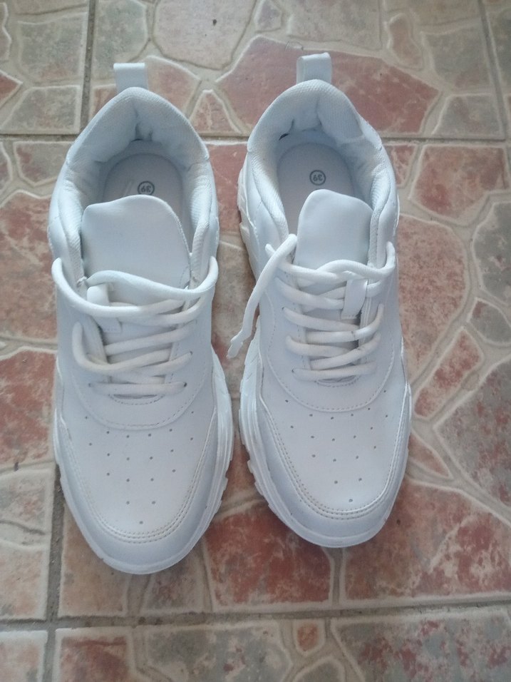 Beyaz, sade ve desensiz kadın spor ayakkabısı, kauçuk malzemeden ve wedge topuklu, spor ve günlük kullanıma uygun şık tasarım.