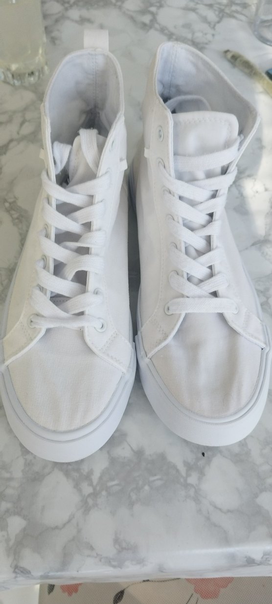 Sentetik kumaştan beyaz kadın spor ayakkabılar, yüksek tabanlı. Desensiz ve günlük kullanıma uygun, zahmetsiz şıklık sunar.