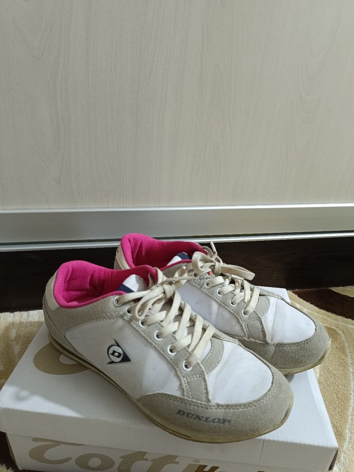 Beyaz kadın spor ayakkabısı, düz kauçuk tabanlı ve gri baskılı detaylara sahip. Velcro bantlı ve sokak stili için uygun.