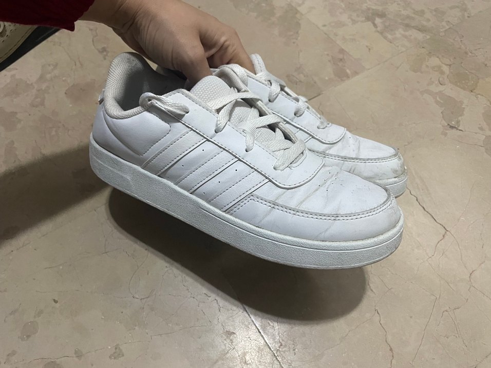 Beyaz renkli, bağcıklı ve lastik tabanlı kadın spor sneaker. Athleisure ve sokak stiline uygun, spor için rahat.orjinaldir sadece içine taban alınacak bir de arkasında az kumaşı topuğun orası yırtık o kdr