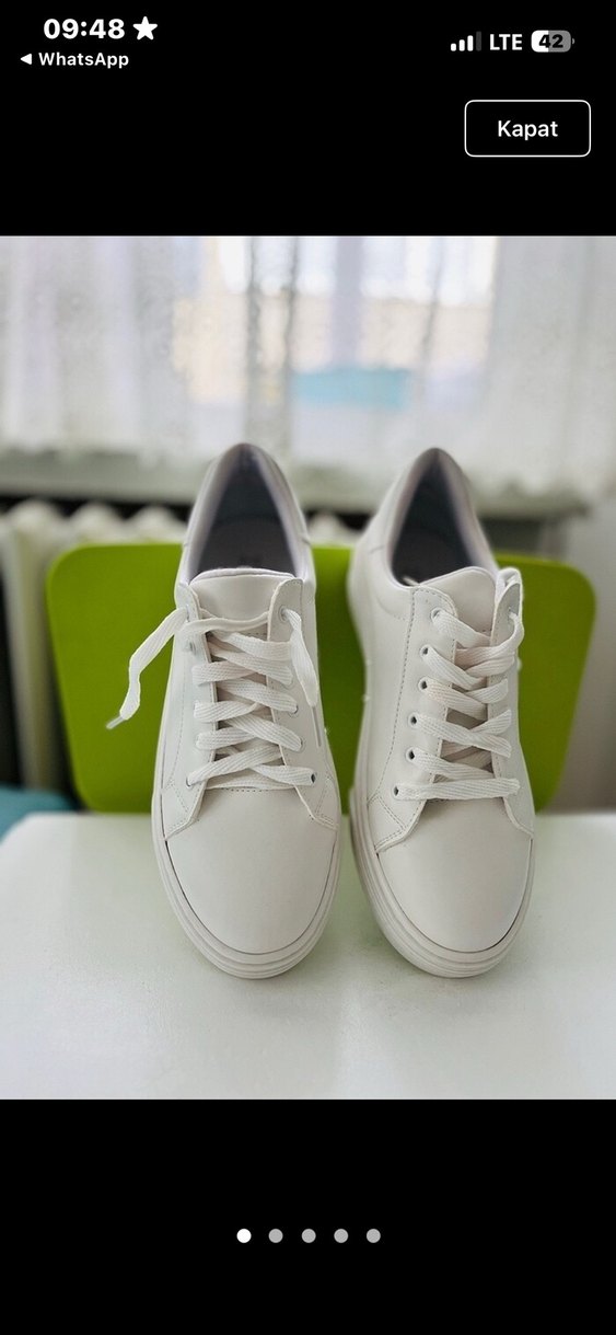 Beyaz, lastik malzemeden yapılmış, stiletto topuklu kadın spor ayakkabısı. Desensiz ve şık tasarımıyla günlük sokak modasına uygun.