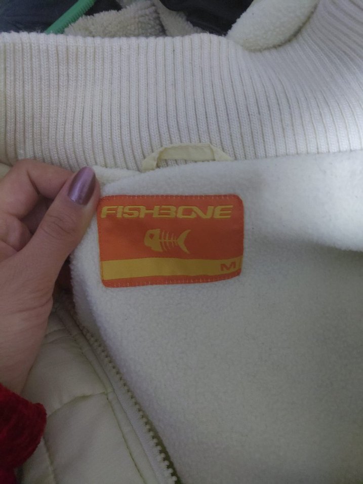 beyaz kadın mont. FISHBONE etiketli. aşağıdan iplerle daralır genişler şekildedir bir iki kere kullanıldı yeni gibi sorun sıkıntısı yoktur