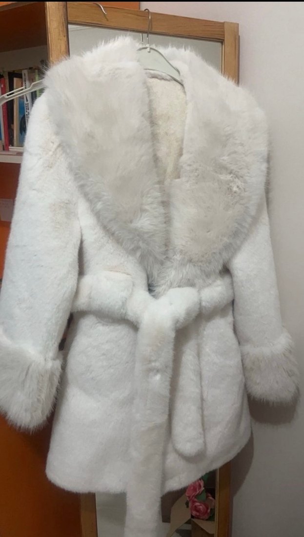 Beyaz renkli, kemerli ve uzun kollu kadın kabanı, suni kürk detaylıdır. Yumuşak kumaştan yapılmış olup midi boydadır ve günlük kullanıma uygundur. ❄️