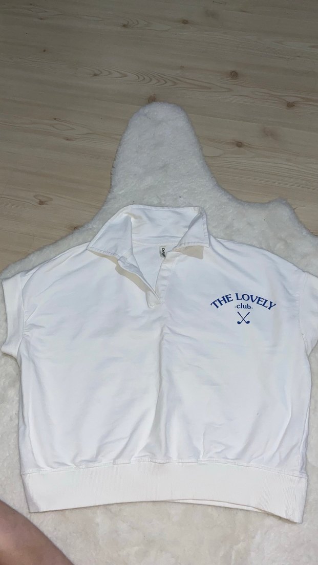 Beyaz, , kısa kollu, yakalı, bol kesim kadın sweatshirt. Yumuşak ve sıcak kumaştan, baskılı desene sahip, günlük sokak stili için uygun.